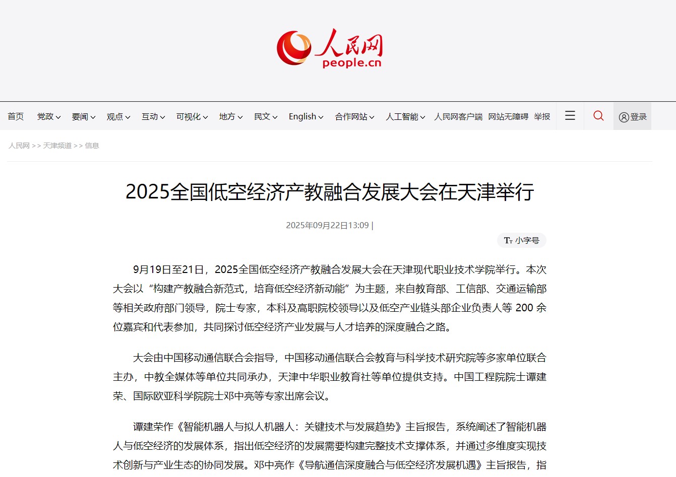 9月19日至21日,2025全国低空经济产教融合发展大会在天津现代职业技术学院举行。本次大会以“构建产教融合新范式,培育低空经济新动能”为主题,来自教育部、工信部、交通运输部等相关政府部门领导,院士专家,本科及高职院校领导以及低空产业链头部企业负责人等 200 余位嘉宾和代表参加,共同探讨低空经济产业发展与人才培养的深度融合之路。
