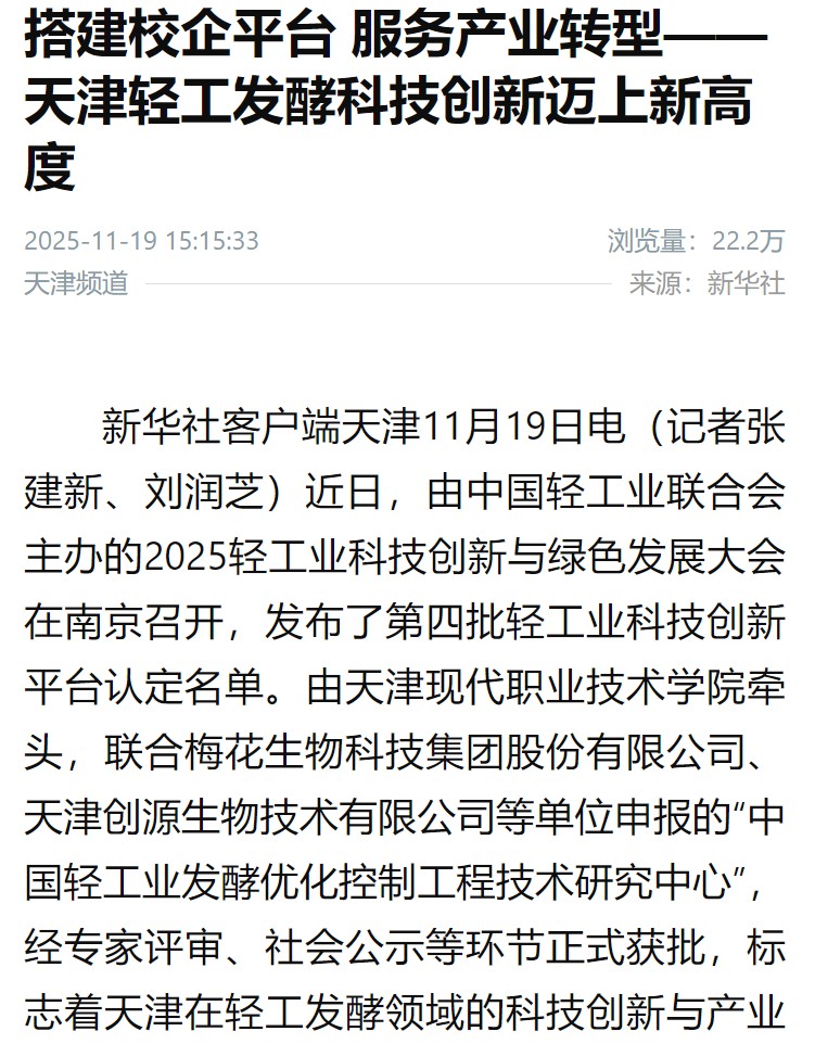 新华社客户端天津11月19日电(记者张建新、刘润芝)近日,由中国轻工业联合会主办的2025轻工业科技创新与绿色发展大会在南京召开,发布了第四批轻工业科技创新平台认定名单。由天津现代职业技术学院牵头,联合梅花生物科技集团股份有限公司、天津创源生物技术有限公司等单位申报的“中国轻工业发酵优化控制工程技术研究中心”,经专家评审、社会公示等环节正式获批,标志着天津在轻工发酵领域的科技创新与产业服务能力迈上新台阶。