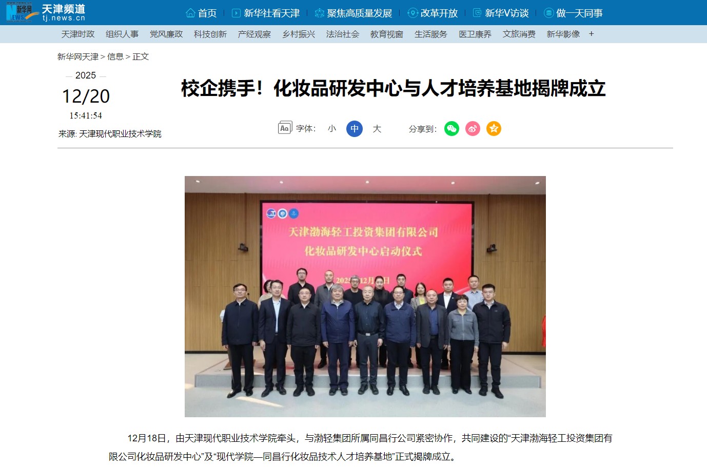 12月18日,由天津现代职业技术学院牵头,与渤轻集团所属同昌行公司紧密协作,共同建设的“天津渤海轻工投资集团有限公司化妆品研发中心”及“现代学院—同昌行化妆品技术人才培养基地”正式揭牌成立。
