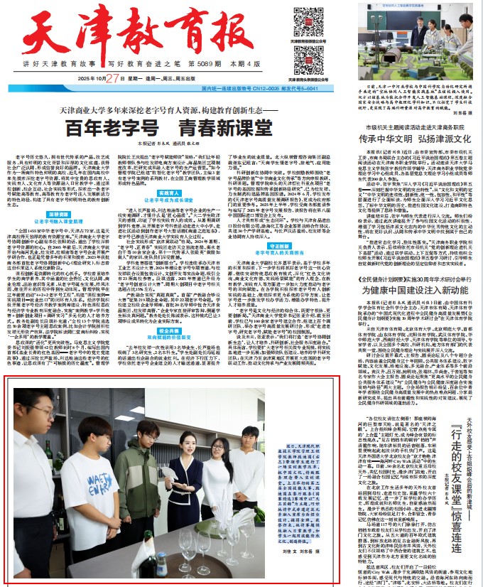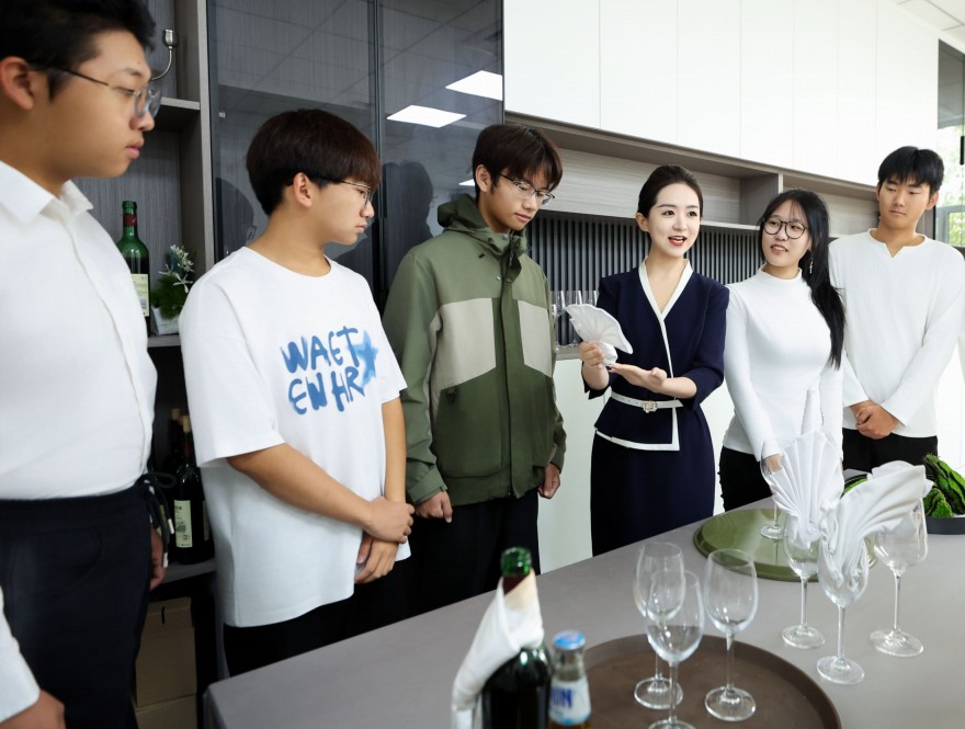 近日,天津现代职业技术学院管理工程学院教师段迪圆(右三)带领学生进行了一场实训教学改革,把中国文化、精致服务理念带入实训课堂。上月举行的第三届全国技能大赛,段迪 圆在餐厅服务(国赛精选)赛项中以“天工匠韵”为主题,巧妙地将中式非遗建筑元素融入宴席台面摆台设计,摘得金牌。载誉归来,她将赛题模块融入日常教学,和学生一起用技能传承文化、创造价值。