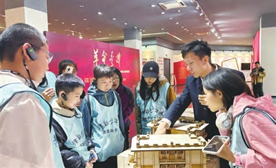 “十四五”期间,天津城建大学创新打造革命丰碑展馆,首创“以建筑说党史”的育人新范式,累计接待近千个支部,10万余人次参观学习,打造集学习、展示、宣讲、研究于一体的综合性红色资源共享平台。图为学校利用复原旧址模型,向参观者生动讲述红色建筑承载的革命故事。(图片来源:天津城建大学)