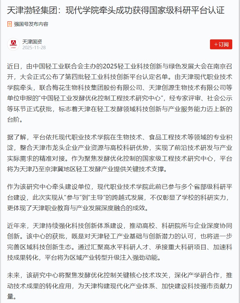 近日,由中国轻工业联合会主办的2025轻工业科技创新与绿色发展大会在南京召开,大会正式公布了第四批轻工业科技创新平台认定名单。由天津现代职业技术学院牵头,联合梅花生物科技集团股份有限公司、天津创源生物技术有限公司等单位申报的“中国轻工业发酵优化控制工程技术研究中心”,经专家评审、社会公示等环节正式获批,标志着天津在轻工发酵领域科技创新与产业服务能力迈上新的台阶。